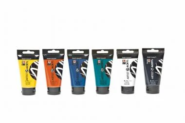 Farben: zitronengelb, zinnoberrot, phthaloblau, phthalogrün hell, titanweiß und lampenschwarz,