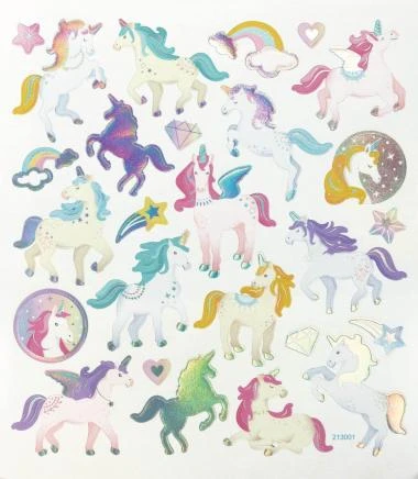 Bogengröße: ca. 145 x 170 mm, Motivgröße: ca. 15 – 45 mm, pastell-bunt, mit Hotfoil irisierend, 56 Sticker auf 2 Bogen