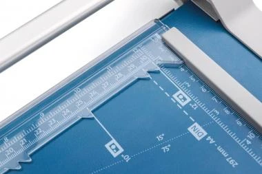Die universell im Büro oder Zuhause einsetzbare Schneidemaschine für schnelles Schneiden von Papier und Fotos. Der geschlossene Messerschutz für das geschliffene Rundmesser sichert eine einfache und sichere Handhabung für präzise Schnitte. Die automatische Pressung an der Schnittstelle mit dem transparenten Anpresslineal, sowie zwei Winkelanlagen und zahlreiche Orientierungslinien in DIN und Fotoformaten auf dem Tisch, erleichtern das Arbeiten.