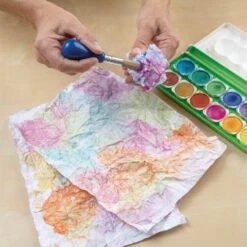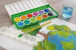 Der Farbkasten besteht zu 100% aus recyceltem Kunststoff und enthält 12 Farbnäpfchen in leuchtenden Farben und eine Deckweißtube. Die Farbnäpfchen können ausgetauscht und umsortiert werden, sodass immer die passenden Farben nebeneinander liegen. Der Deckfarbkasten enthält zusätzlich eine herausnehmbare Mischpalette.