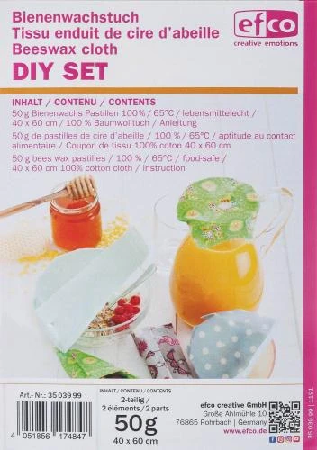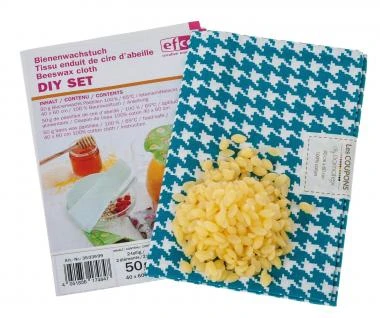 Inhalt: 1 Baumwollstoff aus 100 % Baumwolle, unverbindlich sortiert, ca. 40 x 60 cm, Bienenwachs-Pastillen, 100 % /65 °C lebensmittelecht, gefiltert, honiggelb, 50 g, inkl. Anleitung, 1 Set