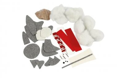 vorgeschnittene Filzteile in den Farben grau, rot, rohweiß, schwarze Holzperlen, Polyesterfüllung, Kartonstreifen, Strickschal und Faden, inkl. Step by Step Anleitung, 1 Set