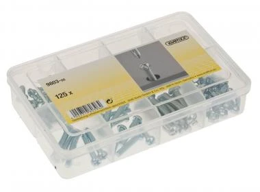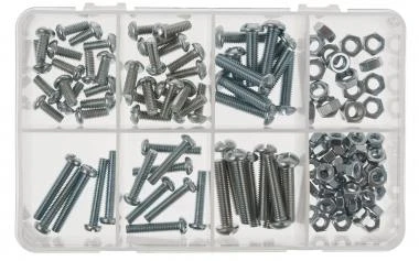 Linsenkopf-, Schlitz-, Kreuzschlitzschrauben und Muttern.