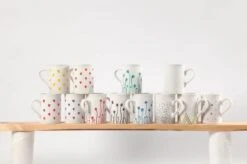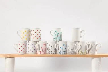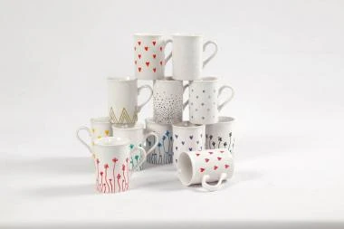 Farbe auf Wasserbasis. Der Untergrund muss fett- und staubfrei sein. Nach dem Anmalen 8 Stunden trocknen lassen, danach im nicht vorgeheizten Backofen bei 230°C ca. 40 Minuten einbrennen und im Ofen auskühlen lassen. Schnittflächen und Trinkränder nicht bemalen.