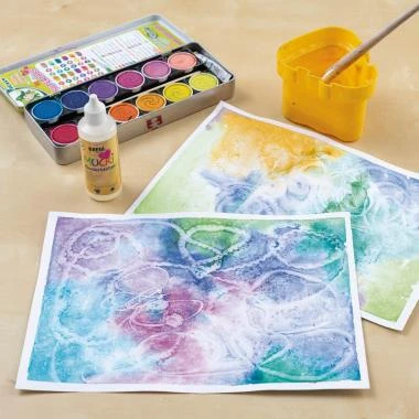 Die Deckfarben von Jolly zeichnen sich durch eine besonders hohe Pigmentdichte aus. So leuchten die 12 Farben besonders intensiv und sind außerdem gut deckend. Die einzelnen Farbnäpfchen können ausgetauscht und umsortiert werden. Farbkasten in den Farben hellgelb, orange, zinnoberrot, magenta, violett, ultramarinblau, cyanblau, hellgrün, dunkelgrün, goldocker, rotbraun und schwarz, Borstenpinsel in Gr. 10, Rundpinsel in Gr. 8 und 1 Tube Deckweiß.
