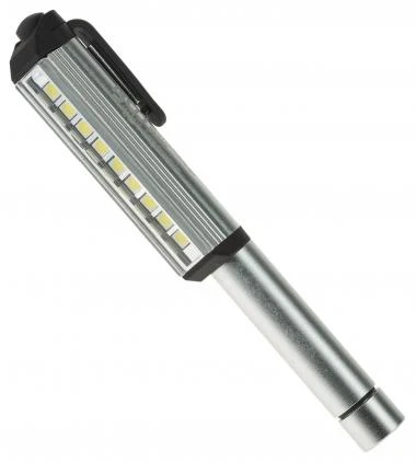 Der handliche LED-Stift verfügt über 9 ultrahelle LEDs zum Ausleuchten des Arbeitsbereiches. An dem Aluminiumgehäuse befindet sich ein magnetischer, schwenkbarer Halteclip. Lieferung inkl. 3 Batterien 1,5V (AAA). Maße: ca. 158 mm lang, 1 Stück