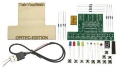 Der Lötbausatz „TrainYourBrain“ eignet sich hervorragend als Lötübung im Unterricht oder für Zuhause. Mehr als 40 Bauteile werden auf der Platine verlötet, u.a. auch ein bereits programmierter Mikroprozessor. Ist die Platine anhand der farbigen Anleitung komplett aufgebaut, startet das im Prozessor installierte Programm „TrainYourBrain“ zu spannenden Spielrunden in unterschiedlichen Level. Auf der 7-Segmentanzeige werden Zahlen von 1 bis 5 ausgegeben, die der Spieler dann fehlerfrei über die Schalter wieder eingeben muss.