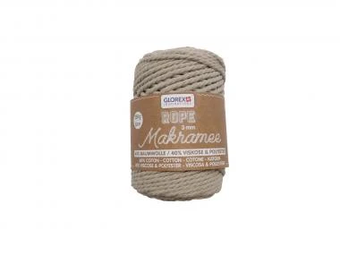 60% Baumwolle und 40% Viskose und Polyester, robuster Faden, gedreht, ideal zum Knüpfen und Stricken, waschbar bis 40°C, Lauflänge ca. 63 m, 250 g, Kordelstärke ca. 3 mm, Häkelnadelstärke 8, Stricknadelstärke 6, taupe, 1 Stück