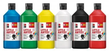 6 Farben je 500 ml in den Farben gelb, rot, blau, grün, weiß und schwarz. Die wasserbasierte Künstlermal- und Bastelfarbe ist hochpigmentiert, vegan und parabenfrei. Sie trocknet schnell matt und deckend auf und eignet sich hervorragend für Leinwand, Malkarton, Papier, Stein, Styropor®, Holz oder Keramik. Sie sind untereinander mischbar und lassen sich mit Wasser verdünnen. Flecken lassen sich aus den meisten Textilien ab 30°C auswaschen. Die Farben sind ab 3+ geeignet. 6er-Set