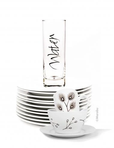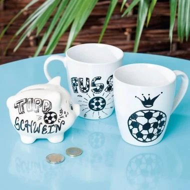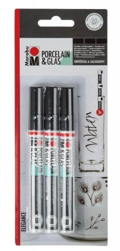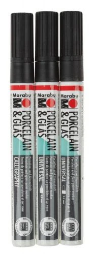 Stifte auf Wasserbasis zum Anmalen von Glas und Porzellan. Der Untergrund muss fett- und staubfrei sein. Nach dem Anmalen 4 Stunden trocknen lassen, danach im nicht vorgeheizten Backofen bei 160°C ca. 30 Minuten einbrennen und im Ofen auskühlen lassen. Schnittflächen und Trinkränder nicht bemalen. Spülmaschinenfest bis 50°C.