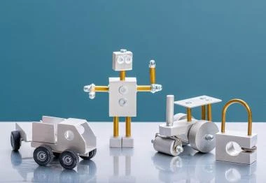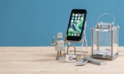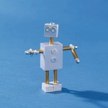 Roboter aus einem Materialmix von Aluminium und Messing. Der Bau des Modells umfasst einige wichtige Bearbeitungsfertigkeiten für Metall. Erforderliche Arbeiten: Anreißen, Körnen, Bohren/Senken, Sägen, Feilen, Gewindeschneiden (Innengewinde M4), Kleben und Montieren. Maße: ca. 90 x 40 x 110 mm, 1 Stück