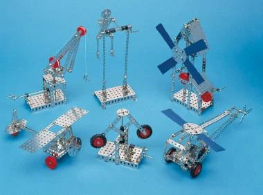 220 Teile inkl. Plan. Einsetzbar für Konstruktionen mit einfachem mechanischem Riemengetriebe und Kegelradgetriebe.Mögliche Modelle: Windmühle, Hubschrauber, Fliehkraft-Modell. Ab 6 Jahren. 1 Stück
