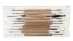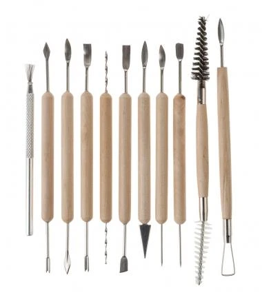 Werkzeugset aus Metall/Holz, zum Bearbeiten von Ton oder ähnlichen Modelliermassen. Maße: ca. 130 – 200 mm lang, inkl. praktischer Aufbewahrungstasche, 10-teilig