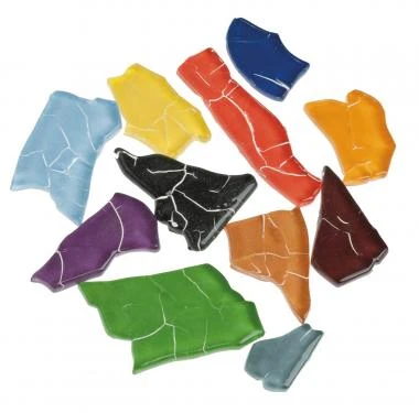 wirkt wie gebrochenes Glas, abgerundete Kanten, frostsicher, verschiedene Größen und Formen, ca. 5 – 45 mm, ca. 4 mm stark, unverbindlich sortiert, bunt-mix, 500 g = ca. 190 Mosaiksteine, ausreichend für eine Fläche von ca. 280 x 280 mm