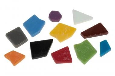ist ein durchgefärbtes Glas mit kräftigen Farben, unregelmäßig in der Form, mit weichen Kanten und glatter Rückseite. Es ist frostbeständig, kann mit einer Mosaikzange geschnitten oder mit Hammer und Spaltkeil geschlagen werden.