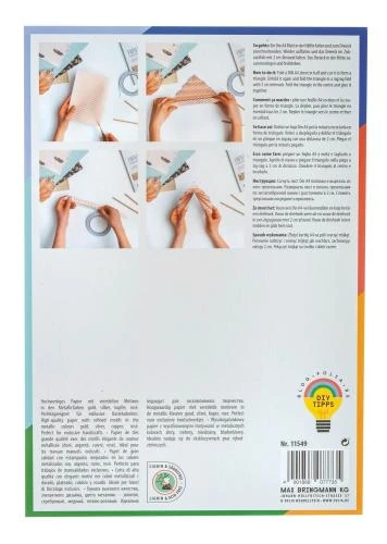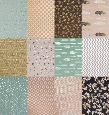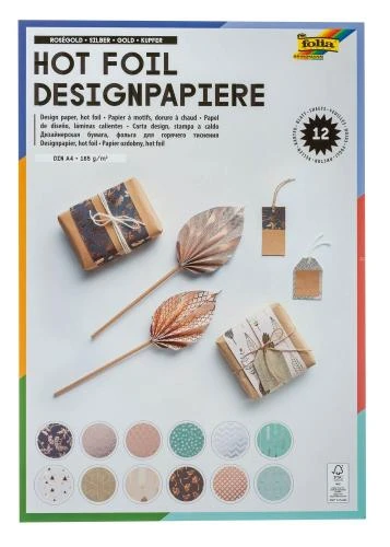 165 g/qm, säurefrei, einseitig bedruckt, verschiedene Motive,hot foil in kupfer, gold, silber und rosé, DIN A4 Format, 12 Blatt