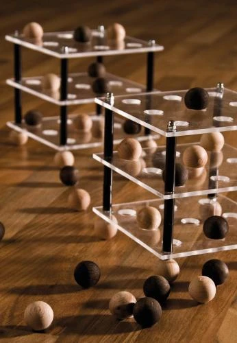Das traditionelle 2D TIC-TAC-TOE auf Papier hat ausgedient, jetzt kommt 3D TIC-TAC-TOE. Anordnung auf drei Acrylplattenebenen mit 15 mm Bohrungen. Abstand zwischen den Ebenen 40 mm durch Abstandshülsen vorgegeben. Das Design der Spielkugeln kann nach eigenen Vorstellungen gestaltet werden.