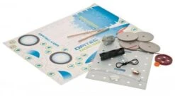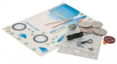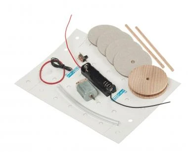 Einfacher und schneller Aufbau des Elektrofahrzeugs im Klassenzimmer möglich. Antrieb mit Elektromotor und Riemenantrieb. Einfacher Stromkreis mit Schalter, auch ohne Löten möglich.