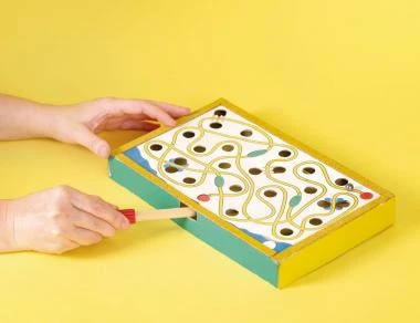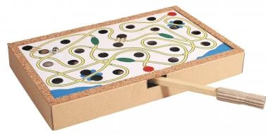 Sieger ist, wer durch das Magnetstück am Spielstab die Kugel am schnellsten über die Linien in das Ziel führt. Das weitgehend vorgefertigte Spiel hat den Vorteil, dass es die Aufmerksamkeit und Konzentration schult. Erforderliche Arbeiten: Schneiden, Zusammenbauen, Kleben und Bemalen.