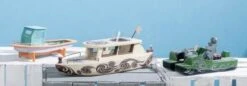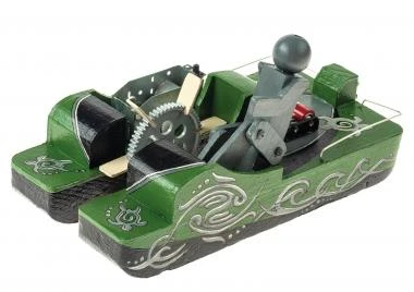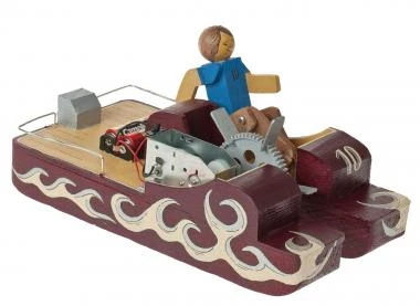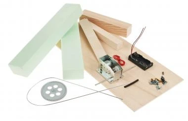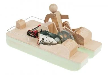 Materialmix aus Styrodur und Sperrholz. Durch eine Mechanik wird die Holzfigur über das Elektrogetriebe angetrieben und es entsteht der Eindruck, dass das Boot wie ein Tretboot funktioniert. Einfacher Stromkreis mit Schiebeschalter, auch ohne Löten möglich. Lieferung ohne 2 Mignon-Batterie 1,5V (AA). Erforderliche Arbeiten: Anreißen, Sägen, Feilen, Schleifen, Leimen und Montieren. Maße: ca. 240 x 135 x 130 mm, 1 Stück