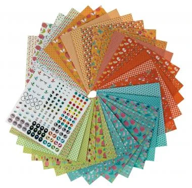 70 g/qm, einseitig bedruckt, 30 verschiedene Motive, inkl. 1 Bogen Sticker-Augen, Maße: ca. 200 x 200 mm, 60 Blatt