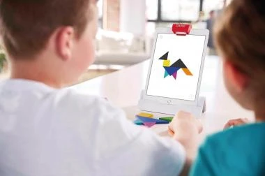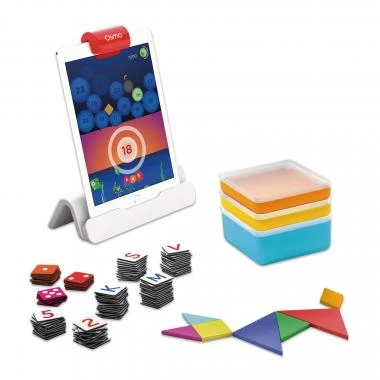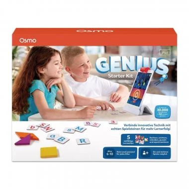 1 Osmo Base für iPad und Reflektor, 5 Spiele-Apps, 7 Tangram-Spielsteine, 40 Zahlen-Spielsteine, 74 Buchstaben-Spielsteine und eine stapelbare Aufbewahrungsbox, 1 Set