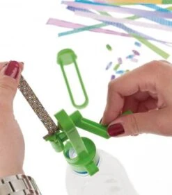Zum besseren Arbeiten, die Papierkurbel auf eine Plastikflasche mit Schraubverschluss, schrauben und dann die Papierperlen je noch Größe und Stärke drehen. Zum Aufbewahren können Sie die Perlen, durch die seitliche Öffnung, in den Schlitz werfen.Einfach Papierstreifen (zum Beispiel von Zeitungen oder Magazinen) einlegen und die Kurbel drehen.