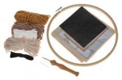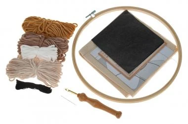Wolle in den Farben weiß, creme, ocker und hellbraun, gesamt 33 m Lauflänge 1 Punch-Nadel mit Holzgriff, 1 Stickstoff ca. 350 x 350 mm, 1 Stickrahmen ca. ø 250 mm, 1 Motiv-Vorlage, Kohlepapier, 7 m Stickgarn in schwarz, 1 Sticknadel, 1 Fädelhilfe, inkl. Schritt-für-Schritt-Anleitung, 1 Set