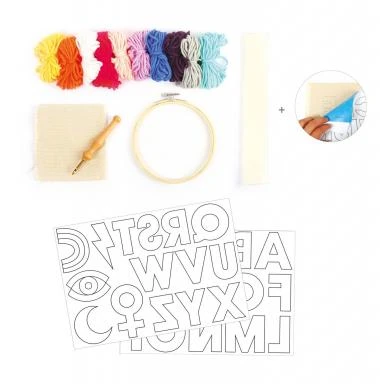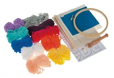 Wolle in den Farben hellgrau, pink, violett dunkel, intensiv blau, Hautfarbe hell, weiß, neonorange, mintgrün, flieder und gelb, gesamt 75 m Lauflänge 1 Punch-Nadel mit Holzgriff, 1 Stickstoff ca. 400 x 400 mm, 1 Stickrahmen ca. ø 150 mm, 2 Blatt mit verschiedenen Motiv-Vorlagen, Kohlepapier, 1 Bügelpapier, 1 Fädelhilfe, inkl. Schritt-für-Schritt-Anleitung, 1 Set