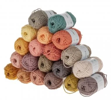 20 Knäuel je 25 g in verschiedenen Farben, Lauflänge je ca. 57,5 m, 100 % Baumwolle, geeignet für Häkel- oder Stricknadel Stärke 3,0 – 4,0, maschinenwaschbar auf 30 °C, 20er-Set
