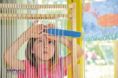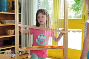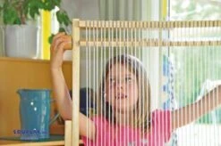 Bespannter Riesen-Webrahmen aus Holz, zum Stellen. Die Halterung lässt sich anhand der beiliegenden Anleitung mit wenigen Handgriffen montieren. Der Webrahmen ist ideal für die Förderung der Feinmotorik und Konzentration.