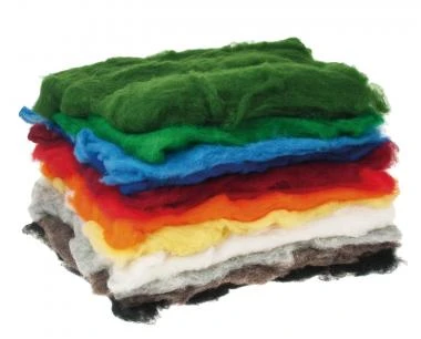 12 Schafschurwollvlies je 100 g in den Farben weiß, hellblau, gelb, hellgrau, grün, orange, braun, dunkelblau, rot, schwarz, dunkelgrün und dunkelrot, zum Nass- und Nadelfilzen (Trockenfilzen) geeignet, gesamt 1200 g, 12er-Set