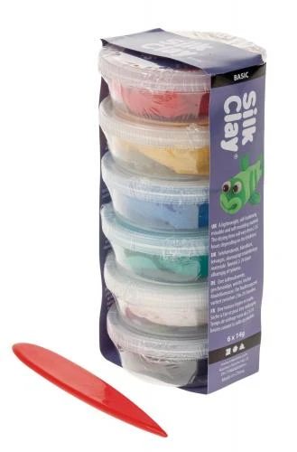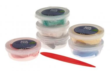 Inhalt: 6 Dosen Silk Clay® je 14 g in den Farben rot, gelb, blau, grün, weiß und schwarz, insgesamt 84 g, 7-teilig