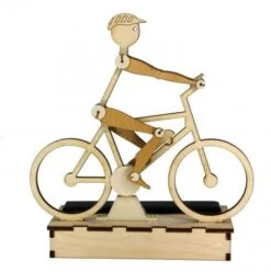 Ob als E-Bike oder als normales Fahrrad aufgebaut (man kann entweder die Luftpumpe oder den Akkupack in den Fahrradrahmen kleben)ist dieses solarbetriebene Modell aus gelaserten Sperrholzteilen ein echter Hingucker. Wenn ausreichend Sonnenlicht auf die großzügig dimensionierte Solarzelle trifft, beginnt der Biker ordentlich in die Pedale zu treten.