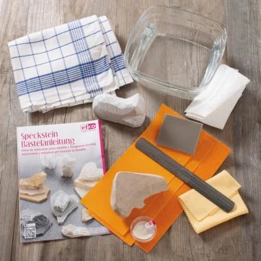 1,5 kg Speckstein, Größe und Farbe unverbindlich sortiert, Specksteinfeile, Schleifpapier, Feinschleifschwamm, Spezial-Specksteinpaste, inkl. Anleitung, 7-teilig