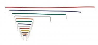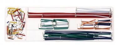 Die Drahtbrücken sind dem Raster der Steckplatine angepasst und montagefertig. Die Drahtbrücken werden mehrfarbig in 14 Längen in einem Sortimentskasten geliefert. 140 Stück