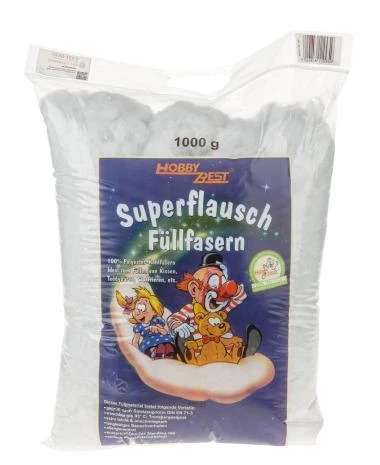 Die extra leichten und anschmiegsamen Füllfasern sind geeignet zum Füllen von Kissen, Teddybären, Stofftieren und vielem mehr. Die Fasern bieten ein langlebiges Bauschverhalten (einfach aufschütteln), sind waschbar bis 95°C, trocknergeeignet, allergieneutral, entsprechen dem OEKO-TEX® Standard 100 und sind geprüft nach Spielzeugnorm DIN EN 71-3. Die Superflausch Füllfasern bestehen aus 100% Polyester-Hohlfasern. 1000 g