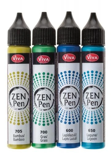 4 Zen-Stifte je 28 ml in den Farben lagune, bambus, lapislazuli und gras. Die Farben werden Punkt für Punkt direkt aus dem Pen auf den gewünschten Untergrund aufgetragen. Die Größe der Pünktchen kann durch Druck auf den Pen variiert werden. Die Farbe hält auf nahezu allen Untergründen. Vor Frost und Hitze schützen. 4er-Set